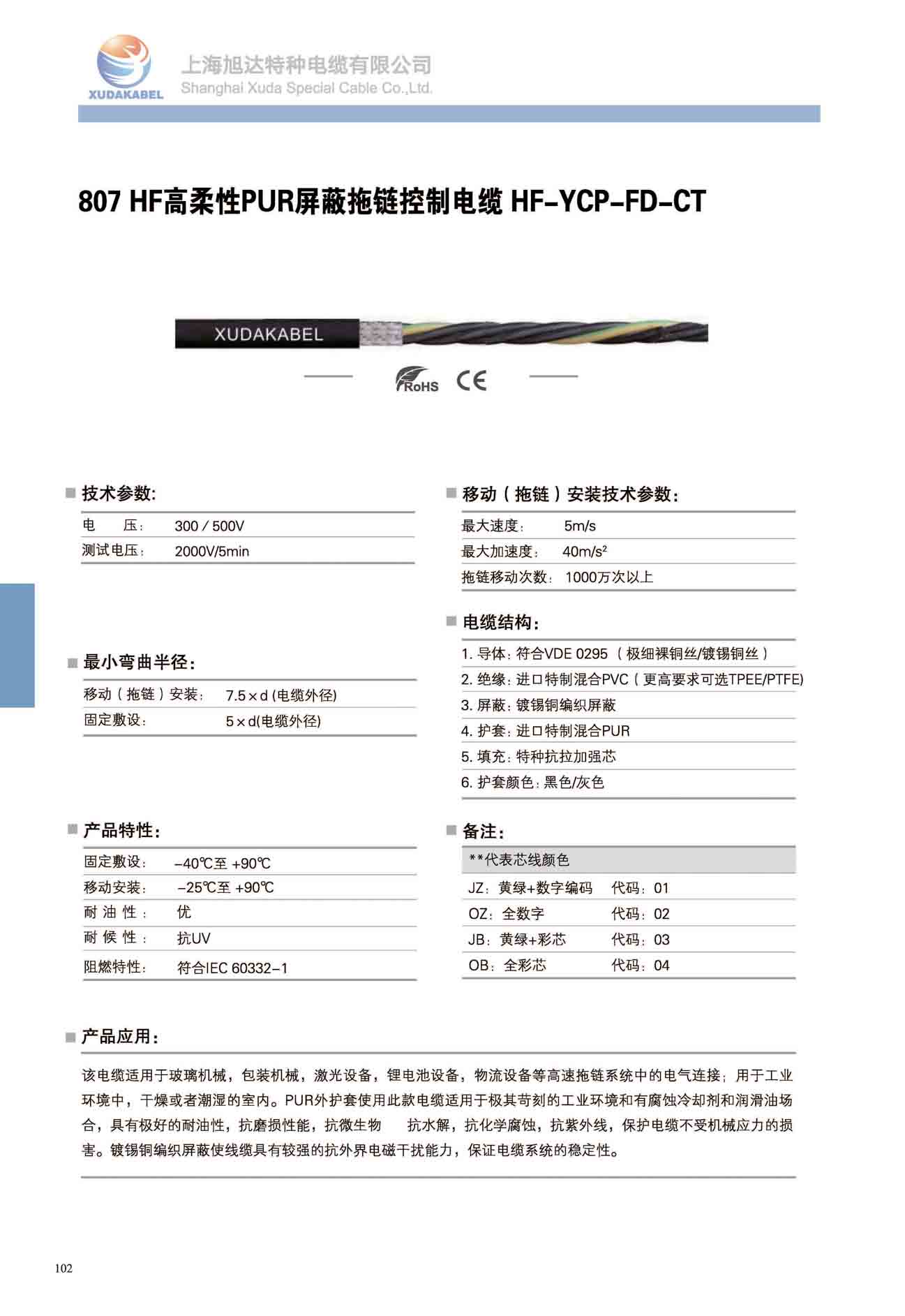 產品簡介:該電纜適用于玻璃機械,包裝機械,激光設備,鋰電池設備,物流設備等高速拖鏈系統中的電氣連接;用于工業環境中,干燥或者潮濕的室內。PUR外護套使用此款電纜適用于極其苛刻的工業環境和有腐蝕冷卻劑和潤滑油場合,具有極好的耐油性,抗磨損性能,抗微生物 抗水解,抗化學腐蝕,抗紫外線,保護電纜不受機械應力的損害。鍍錫銅編織屏蔽使線纜具有較強的抗外界電磁干擾能力,保證電纜系統的穩定性