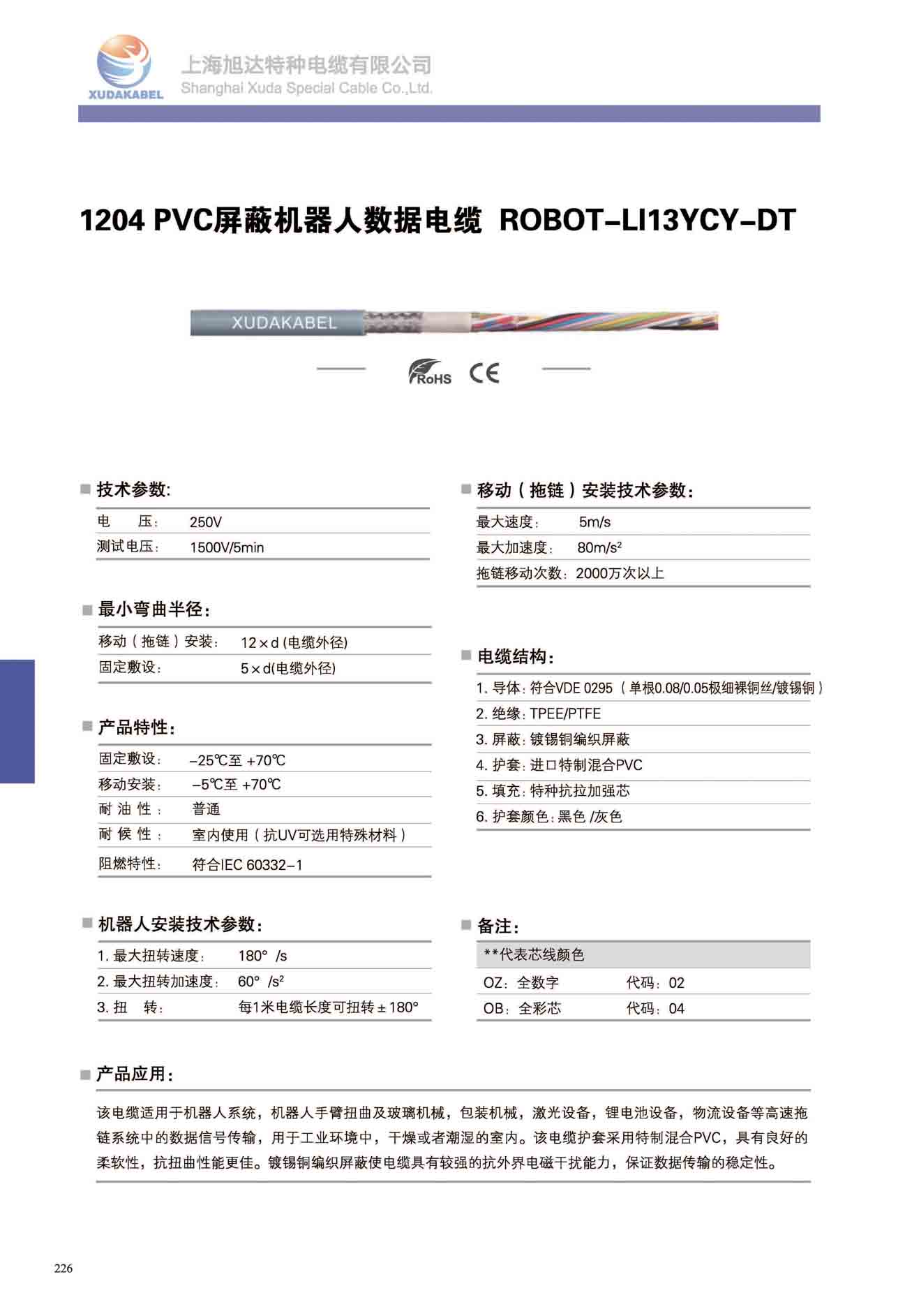 產品簡介:該電纜適用于機器人系統,移動設備,機器人手臂等柔性場所;用于工業環境中,干燥或者潮濕的室內。護套采用進口特制PVC,使線纜具有良好的柔軟性,抗扭曲性能更佳。該電纜適用于機器人系統,移動設備,機器人手臂等柔性場所;用于工業環境中,干燥或者潮濕的室內。護套采用進口特制PVC,使線纜具有良好的柔軟性,抗扭曲性能更佳。鍍錫銅編織屏蔽使電纜具有較強的抗外界電磁干擾能力,保證數據傳輸的穩定性。