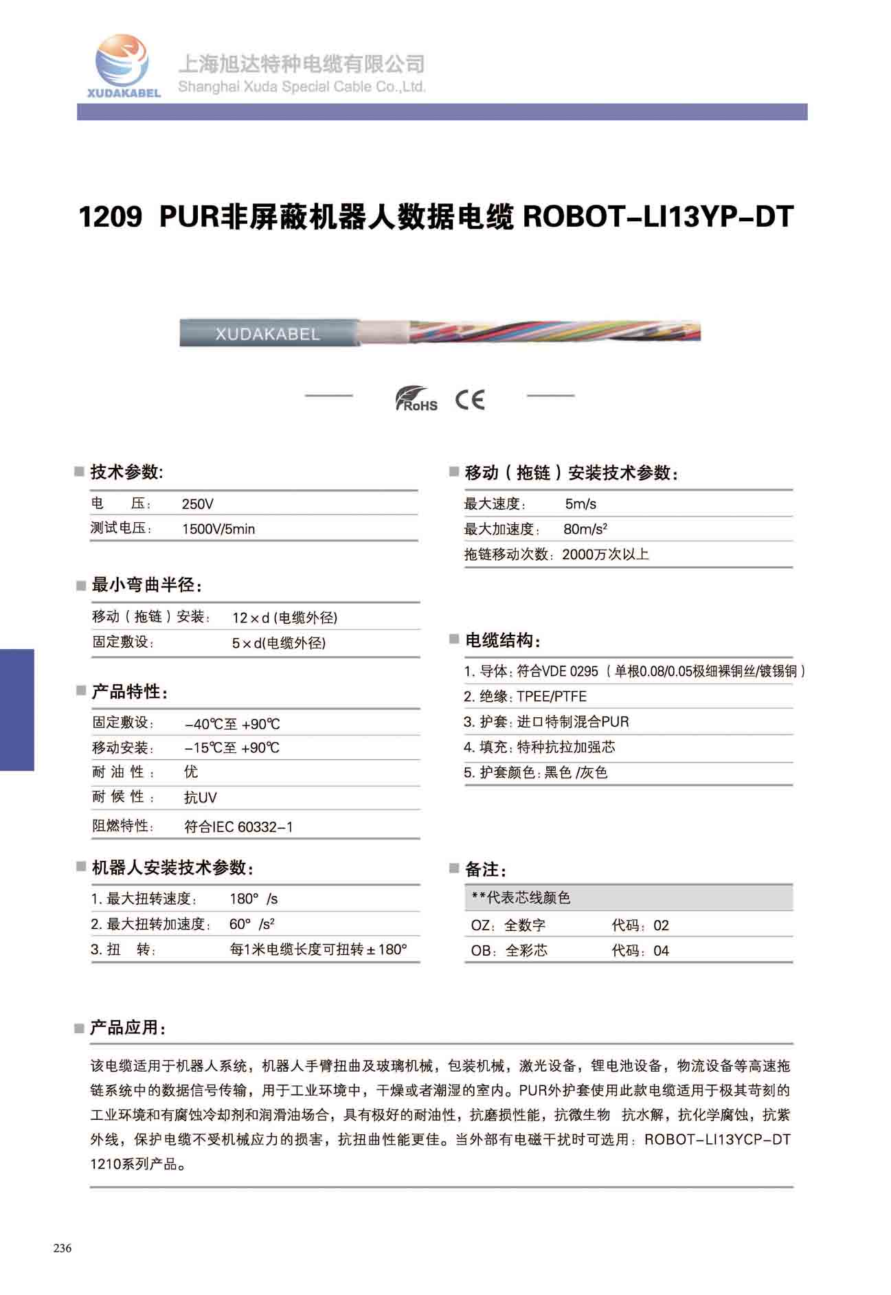 產品簡介:該電纜適用于機器人系統,移動設備,機器人手臂等柔性場所;用于工業環境中,干燥或者潮濕的室內,PUR外護套使用此款電纜適用于極其苛刻的工業環境的有腐蝕冷卻劑和潤滑油場合,具有極好的耐油性,抗麿損性能,抗微生物,抗水解,抗化學腐蝕,搞紫外線,保護電纜不受機械應力的損害,抗扭曲性能更佳。當外部有電磁干擾時,推薦使用帶屏蔽拖鏈電纜;ROBOT-13YCP-DT 1210系列。
