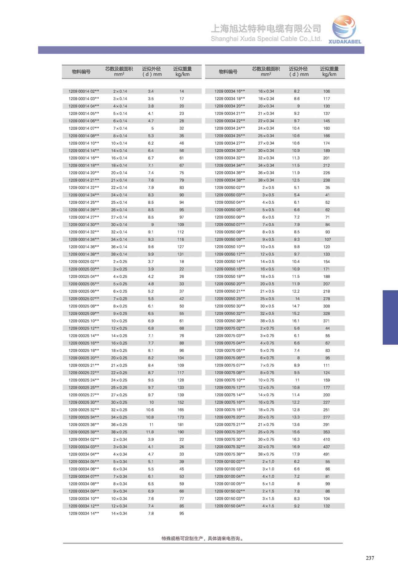 物料編號 芯線及截面積mm2 最大外徑(d)mm 電纜近似重量Kg/km
