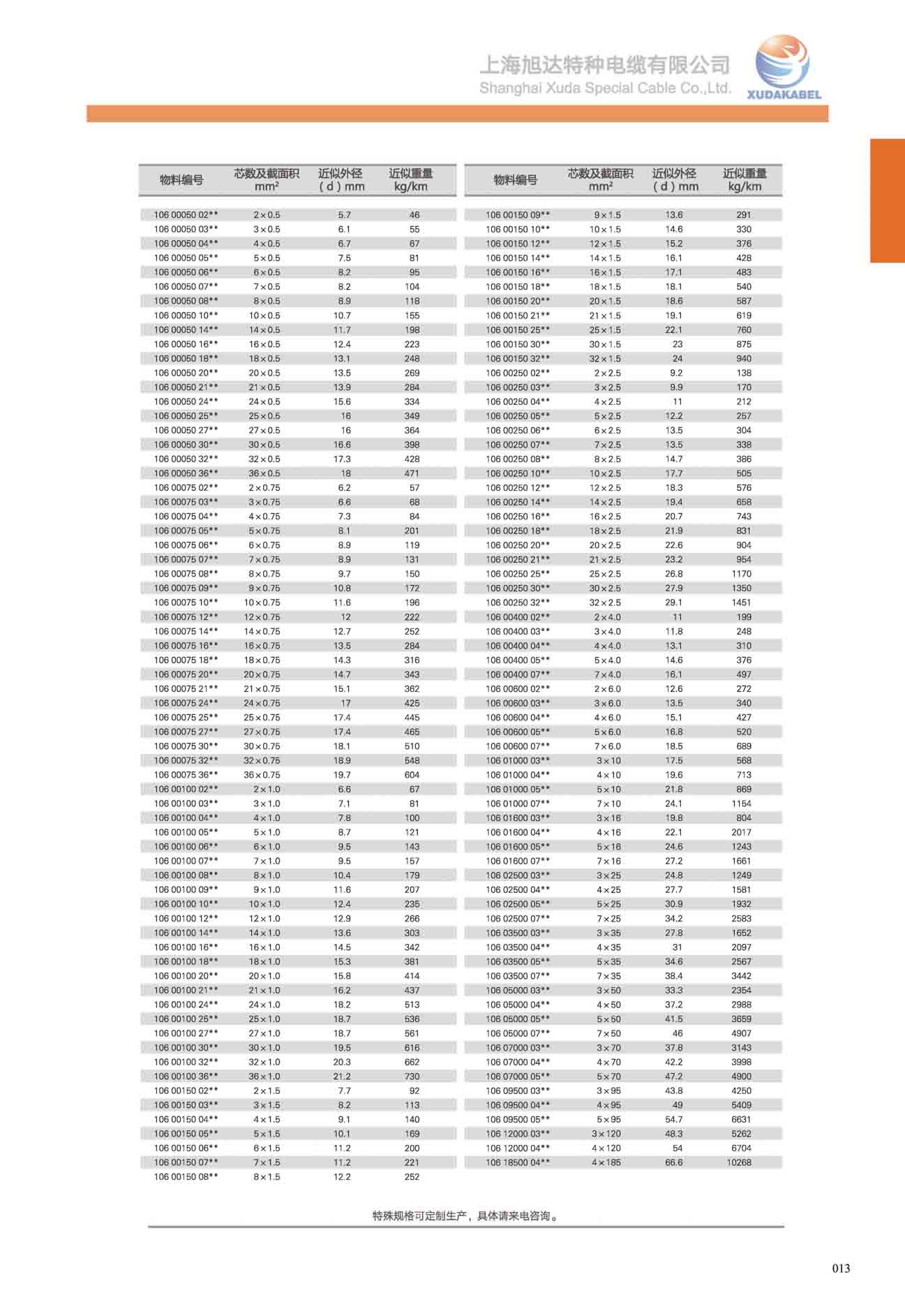 | 物料編號 | 芯線及截面積mm2 | 最大外徑(d)mm | 電纜近似重量Kg/km |