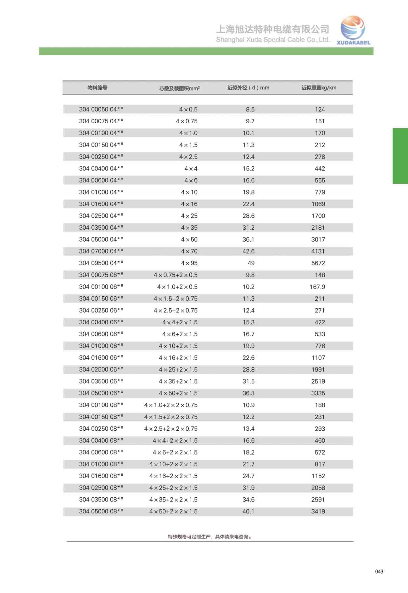 物料編號 芯線及截面積mm2 最大外徑(d)mm 電纜近似重量Kg/km