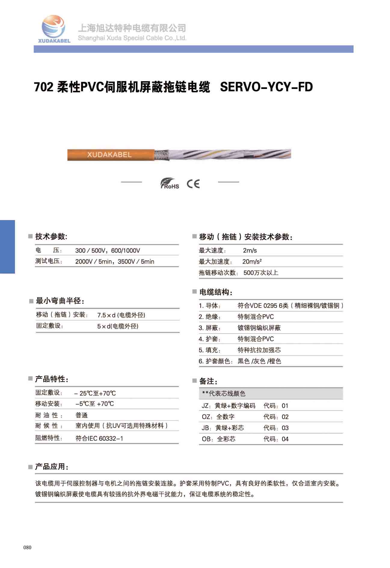 產品簡介:該電纜用于伺服控制器與電機之間的拖鏈安裝連接。護套采用特制PVC,具有良好的柔軟性,僅合適室內安裝。鍍錫銅編織屏蔽使電纜具有較強的抗外界電磁干擾能力,保證電纜系統的穩定性