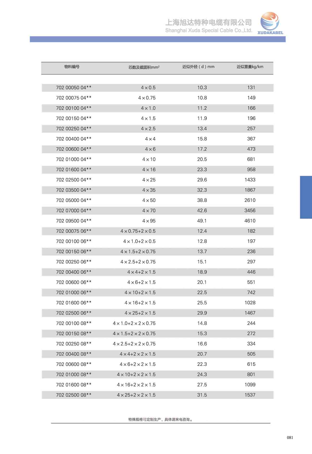 物料編號 芯線及截面積mm2 最大外徑(d)mm 電纜近似重量Kg/km