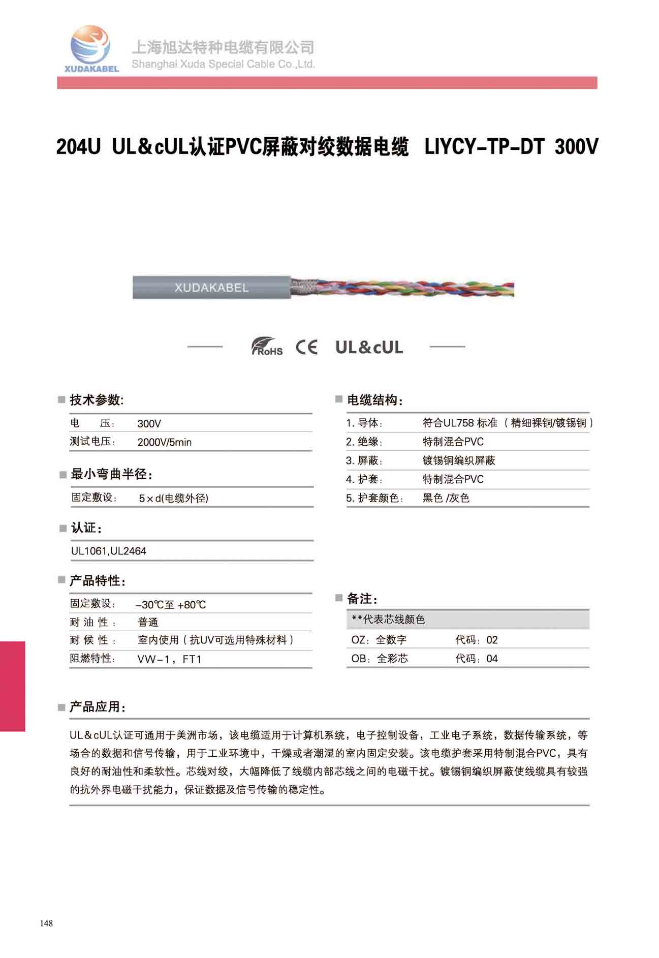 204U UL&cUL認證PVC屏蔽對絞數據電纜 LIYCY-TP-DT 300V