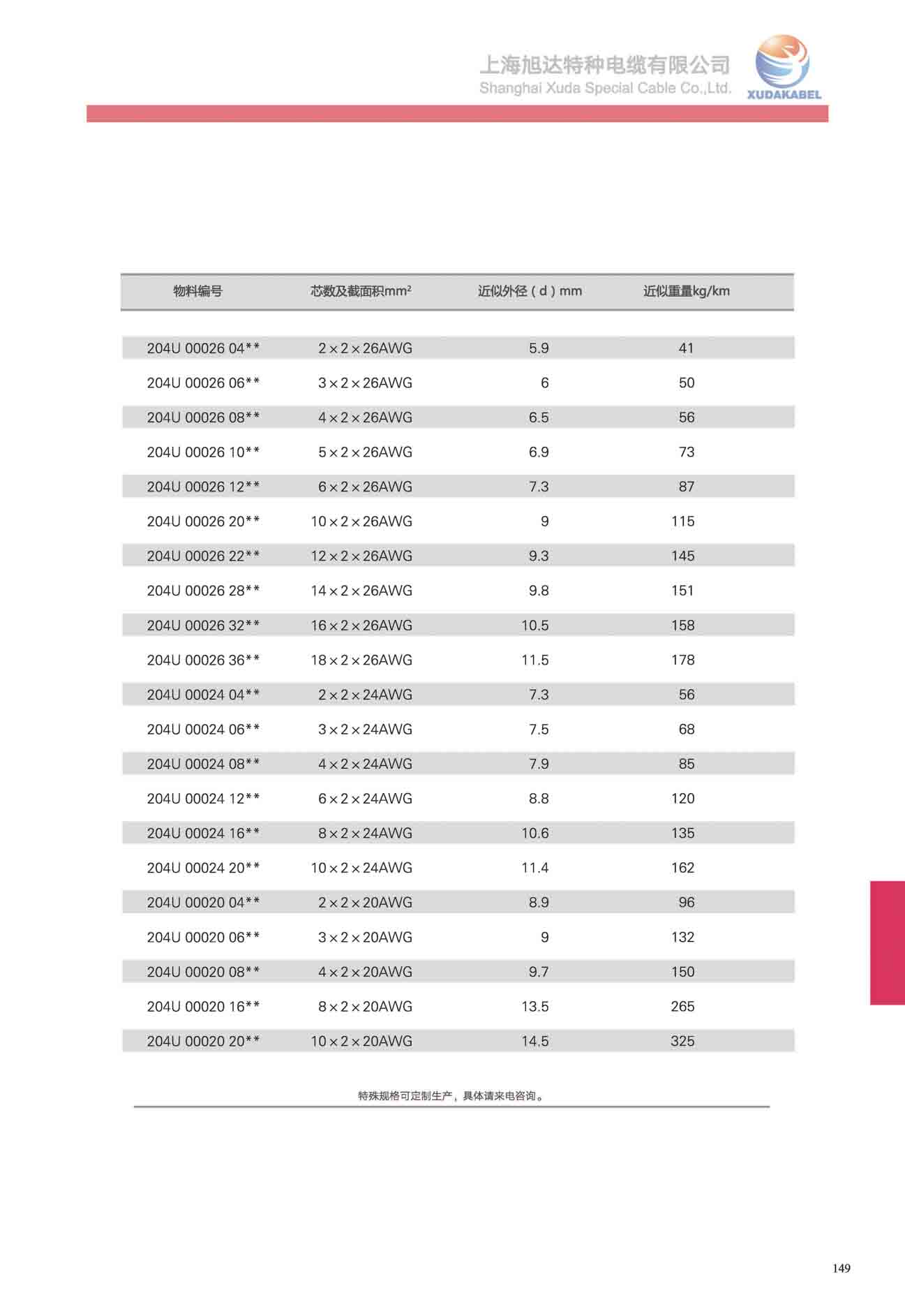 物料編號 芯線及截面積mm2 最大外徑(d)mm 電纜近似重量Kg/km