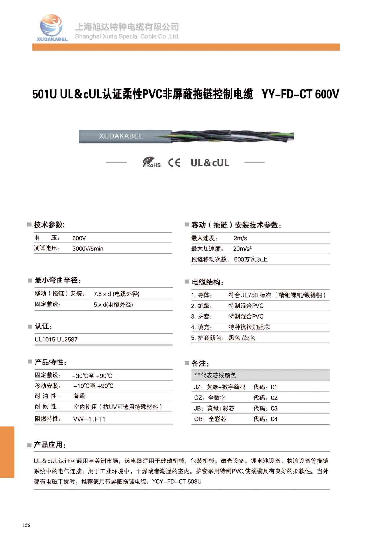 產品簡介:UL&cUL認證可通用與美洲市場,該電纜適用于玻璃機械,包裝機械,激光設備,鋰電池設備,物流設備等拖鏈系統中的電氣連接;用于工業環境中,干燥或者潮濕的室內。護套采用特制PVC,使線纜具有良好的柔軟性。當外部有電磁干擾時,推薦使用帶屏蔽拖鏈電纜:YCY-FD-CT 503U